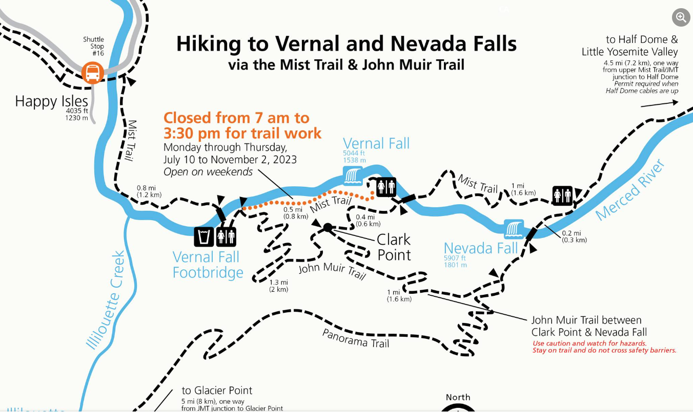 During the Mist Trail section closure, a journey to Nevada Fall will look like this:
