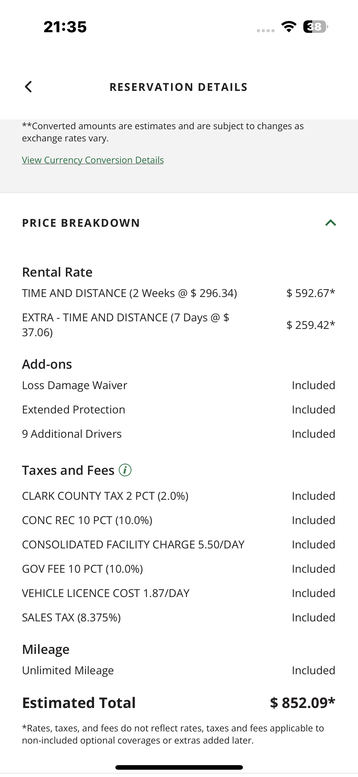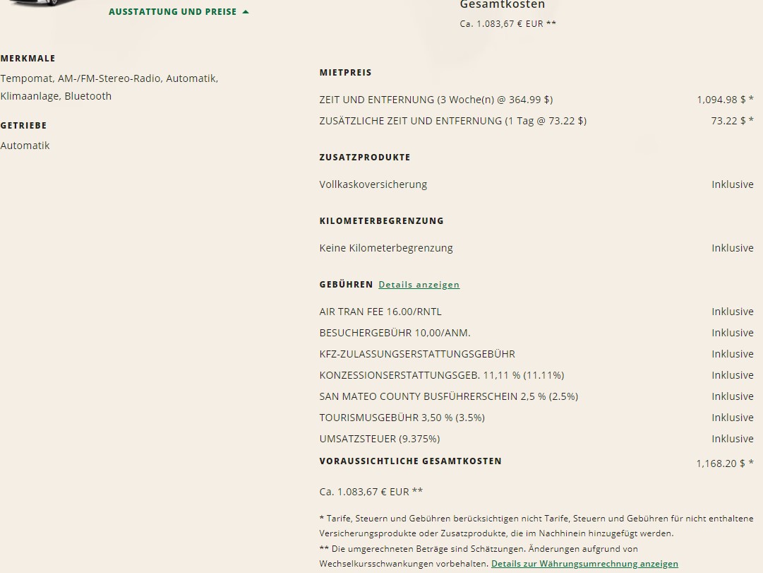 Prijs is nu 852 dollar voor drie weken. In de app en bijvoorbeeld nationalcar.ie is het nog 870 dollar.