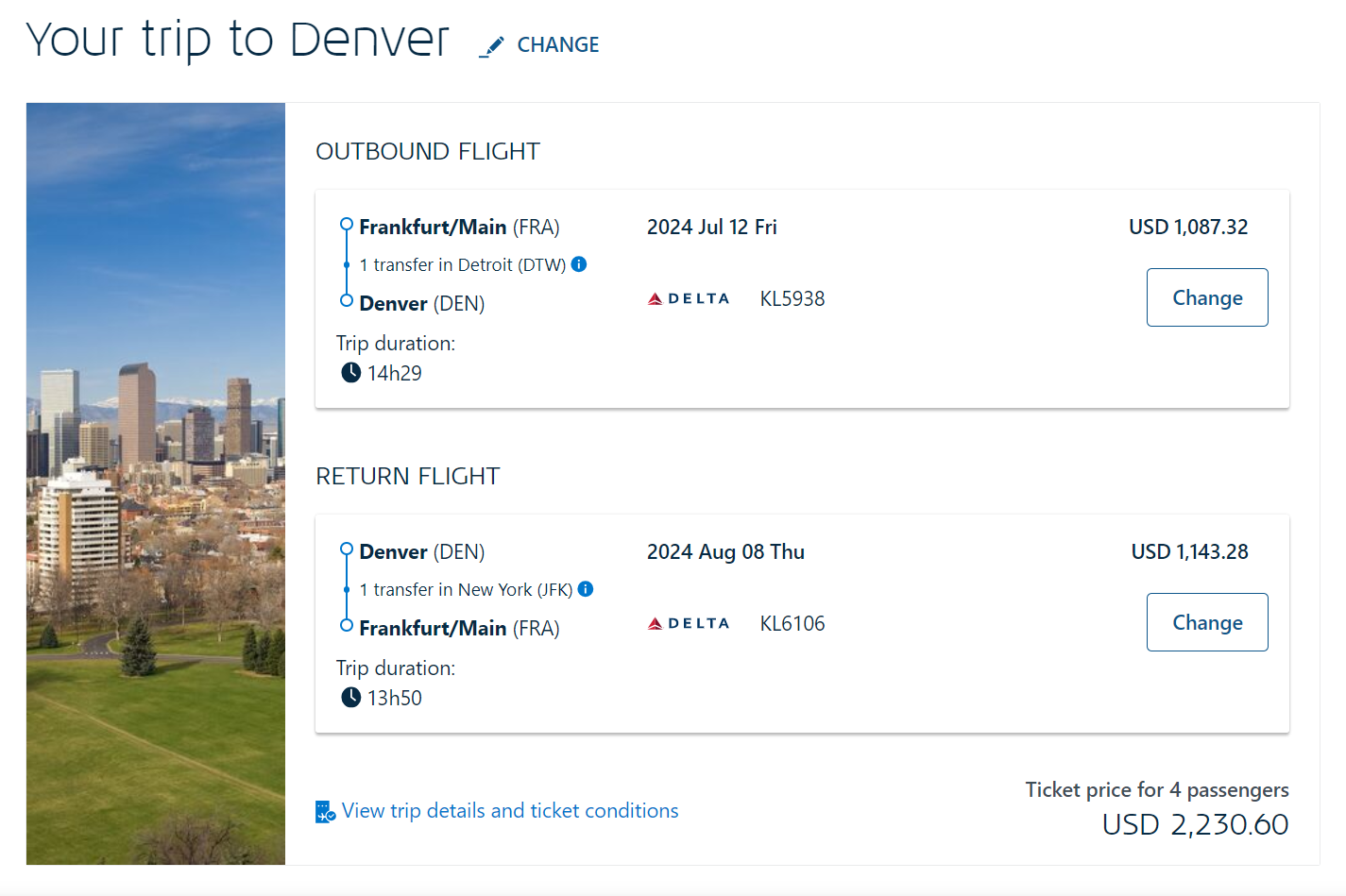 Als ik een dergelijke prijs zag zou ik direct boeken. Ik vind voor heen juli en terug augustus naar Denver geen lagere prijzen dan 1050 pp inclusief koffer en standaard stoelreservering. En dat is met tussenstop en niet eens fijne tijden.