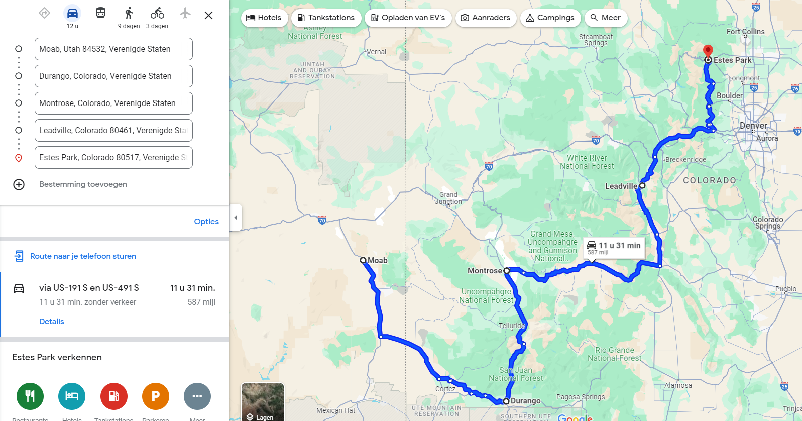 vanuit Moab naar Durango ? (leuk plaatsje). Dan via Million Dollar (ook mooi wandelen !) richting Leadville. Dan doorsteken naar RMNP ?. Wellicht onderweg wat fietsen rondom Dillon Lake (Keystone/Breckenridge). Huur een electrische fiets