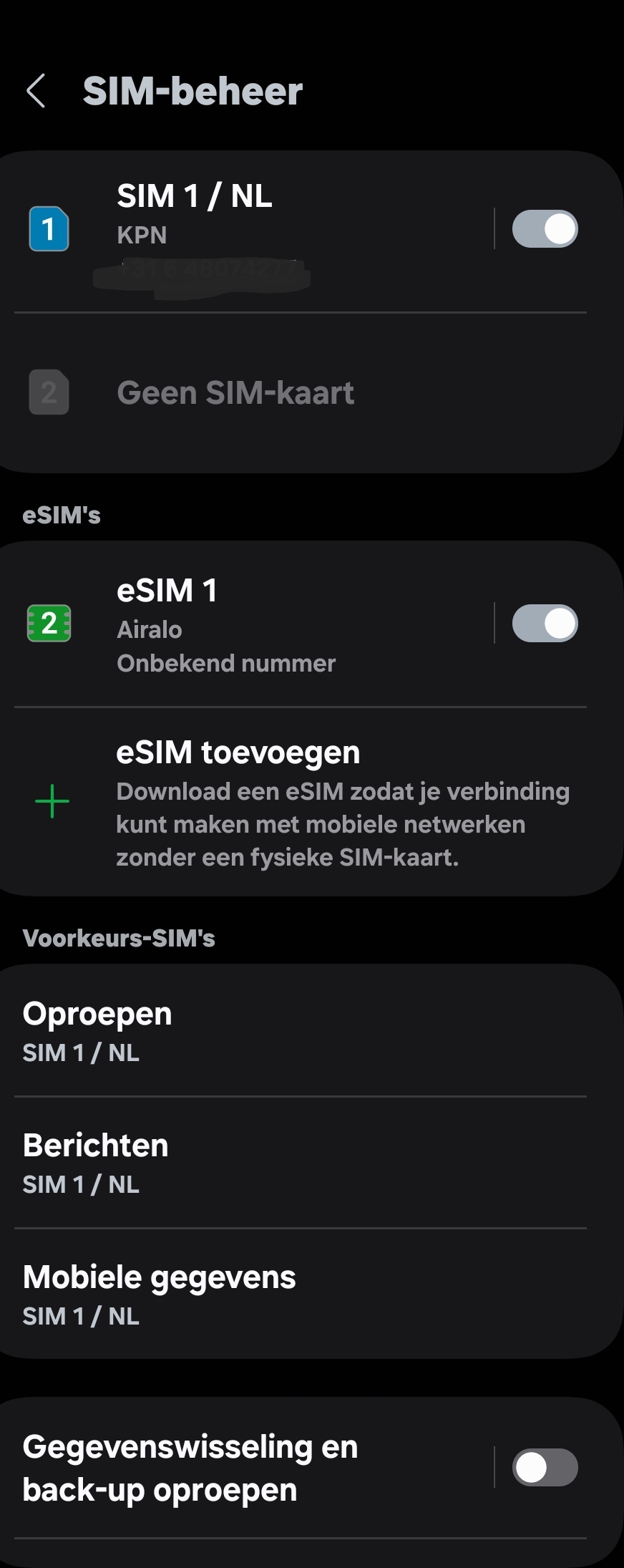 Netwerk staat op automatisch, en roaming aan, data gebruiken wissel ik dan van KPN maar Airalo.....