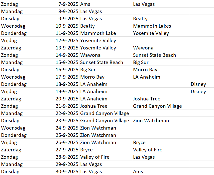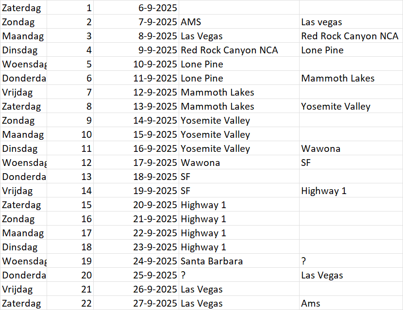 We zijn niet ingeloot voor Phantom Ranch, dus de Grand Canyon is geen must meer.. Ik speel nu met de gedachte voor een rondje Californië. Camper was vanuit Las Vegas verreweg het goedkoopste en die heb ik al geboekt, dus vandaar het startpunt zo.. Plus in Las Vegas is Cruise America goed bereikbaar en de hotels zijn daar betaalbaar. We willen lekker de tijd nemen. Dan kunnen we een volgende keer een rondje vanuit Vegas doen richting het oosten.