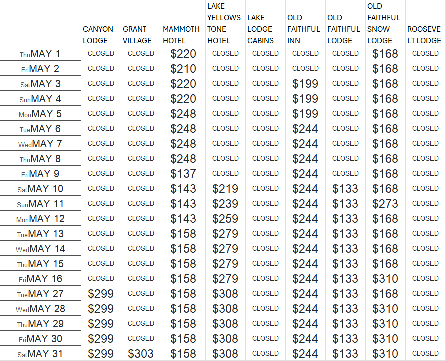 ik heb al even zitten kijken naar overnachtingen in het park voor zowel Yellowstone als Yosemite, ik neem even aan dat juni 2025 vergelijkbaar zal zijn met mei 2025 maar dat zijn stevige prijzen