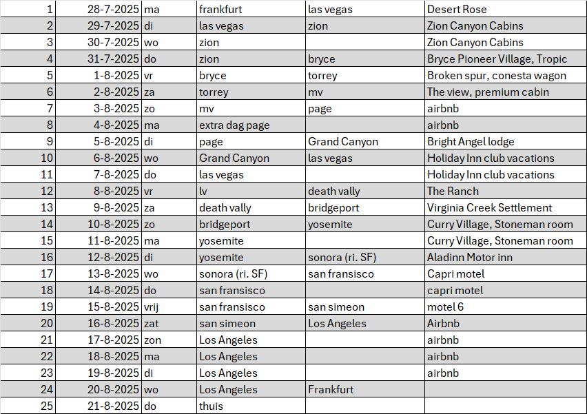 Om wat meer ruimte te krijgen in ons programma, zijn we aan het kijken geweest of we wat kunnen schuiven. We blijven 1 nacht langer weg, die kunnen we inzetten rondom Yosemite. Zitten we in totaal op 25 nachten, ik snoep er steeds iets bij