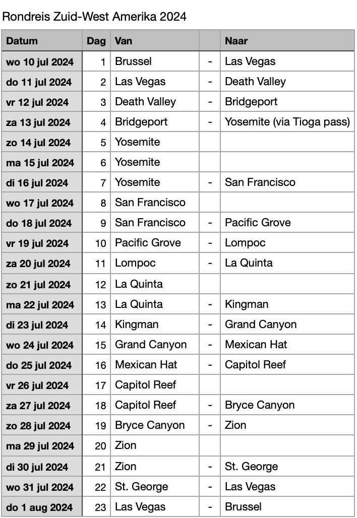 Wat een mooie reis in het vooruitzicht. De kustroute is inderdaad mooi en een mooie afwisseling dus leuk dat jullie die ook doen. Wij gaan deze zomer ook en hopen dat de route weer volledig gereden kan worden. Nog even wat ervaringen: In yosemite hebben we een keer in housekeeping camp gelogeerd in een vrij kale tent met stapelbedden en alleen een lichtje. Dit lag mooi centraal en aan een kiezelstrandje aan de rivier. S nachts wel spannend om in het donker naar het toiletgebouw te gaan want ik zag echt niets en zag overal beren achter de bomen (in gedachten gelukkig alleen). We hadden toen zelf slaapzakken mee. Fietsen huren is in de vallei een aanrader om de files (viel ons nogal tegen de drukte maar was voor entry beperkingen) makkelijk voorbij te rijden. In Las Vegas vonden wij het atomic testing museum overdag leuk en koel om te doen. Ik denk dat wr hier een uur geweest zijn. De kinderen vonden het ook leuk bij een m&m winkel (museumpje);te kijken. Ik zou zelf de nacht tussen zion en las vegas opofferen (je hebt dan al heel veel rotsen gezien) en eventueel een dag extra in SF doen. Maar je hebt alles al gepland denk ik.