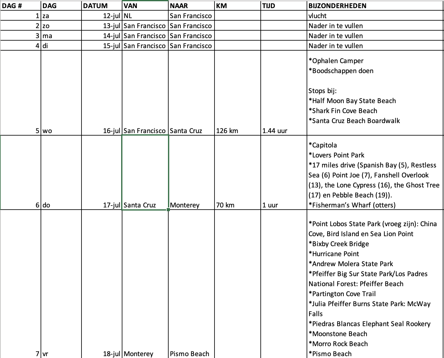 Ik vind het een prachtige route! Lekker lang. Met een camper in SF zou ik trouwens echt nog eens overwegen of je daar wel 4 nachten wilt staan.