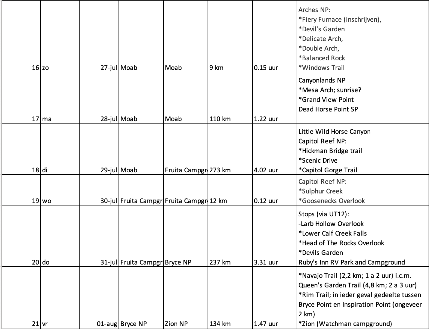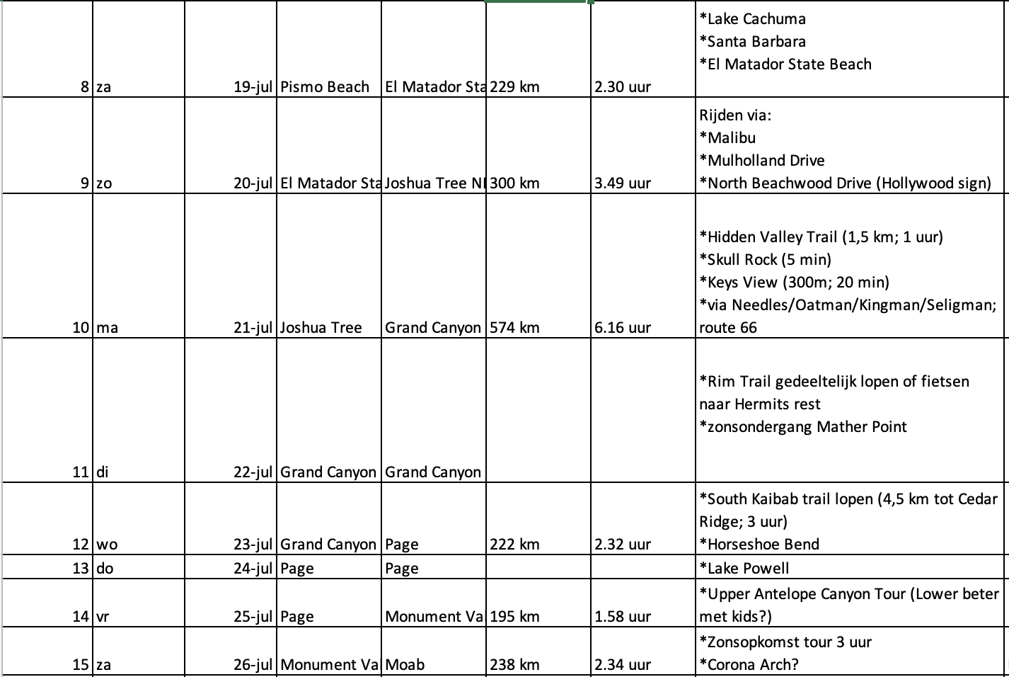Naar aanleiding van de diverse tips hebben wij wat zitten schuiven met het schema. Voor nu 1 dag toegevoegd bij GC, Moab en Page. De tussenstop op de reisdag van Joshua Tree naar GC nu eruit gehaald, waardoor dit wel een lange dag wordt, maar dat geeft ons 1 dag extra bij GC. De 3 dagen SF vooralsnog laten staan. Kings Canyon en Sequoia NP ook toegevoegd.
