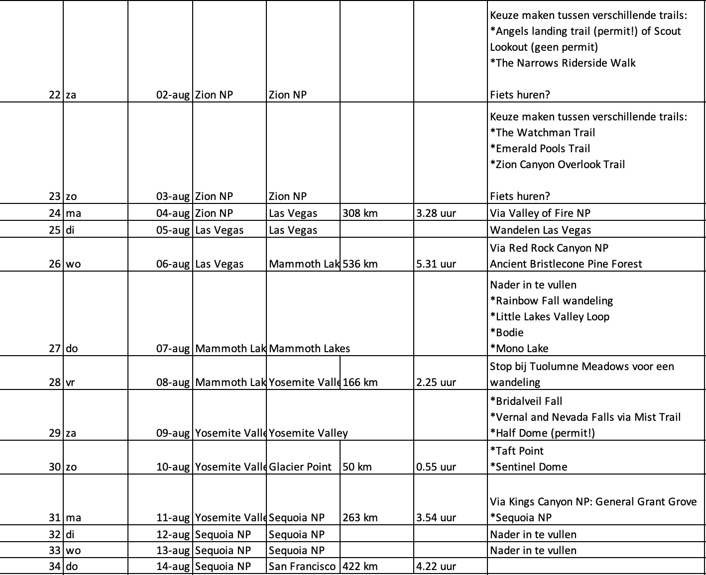 Wij overwegen om de route vanuit Las Vegas te beginnen en dan ons rondje tegen de klok in te doen. Op die manier zijn we eerder in Yosemite en zijn we daar do t/m zaterdag. Nog steeds niet ideaal wat betreft het weekend dus, maar al iets beter t.o.v. onze plannen om vanuit SF te vertrekken. Ook Zion valt dan niet meer in het weekend.