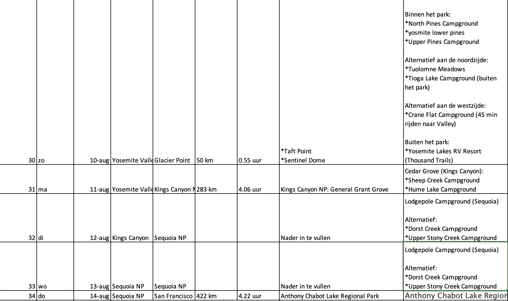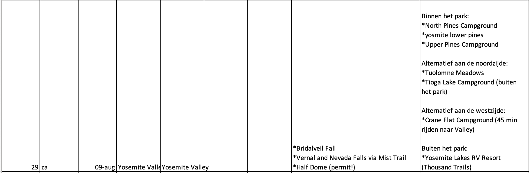 Nog een andere vraag: zoals onze routeschema er nu uit ziet komen wij do 17 juli in Yosemite Valley aan, waar we dan zondag weer richting Kings Canyon NP vertrekken. We zijn dus deels in het weekend in Yosemite. Is het beter om nog 1 dag eerder in Yosemite aan te komen, zodat we op die manier nog 1 dag minder in het weekend daar zijn?