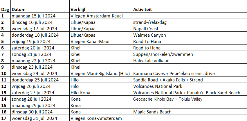 New York-idee laten we varen en gaan voor 15 dagen Hawai (+ de reisdagen). De opzet van @dejong89 lijkt ons wel wat, ook nadat we zelf de eilanden in ons op hebben genomen.