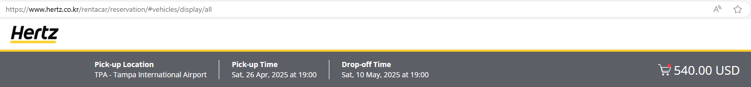 Hertz Korea geeft met de 51k code prijzen van 998 USD voor een standaard SUV. Een Midsize is een stuk goedkoper (794) en geef je ook toegang tot de gold aisle, als je even gratis lid wordt van Hertz. Dan heb je minimaal een kleine SUV en altijd kans op iets '' groters '