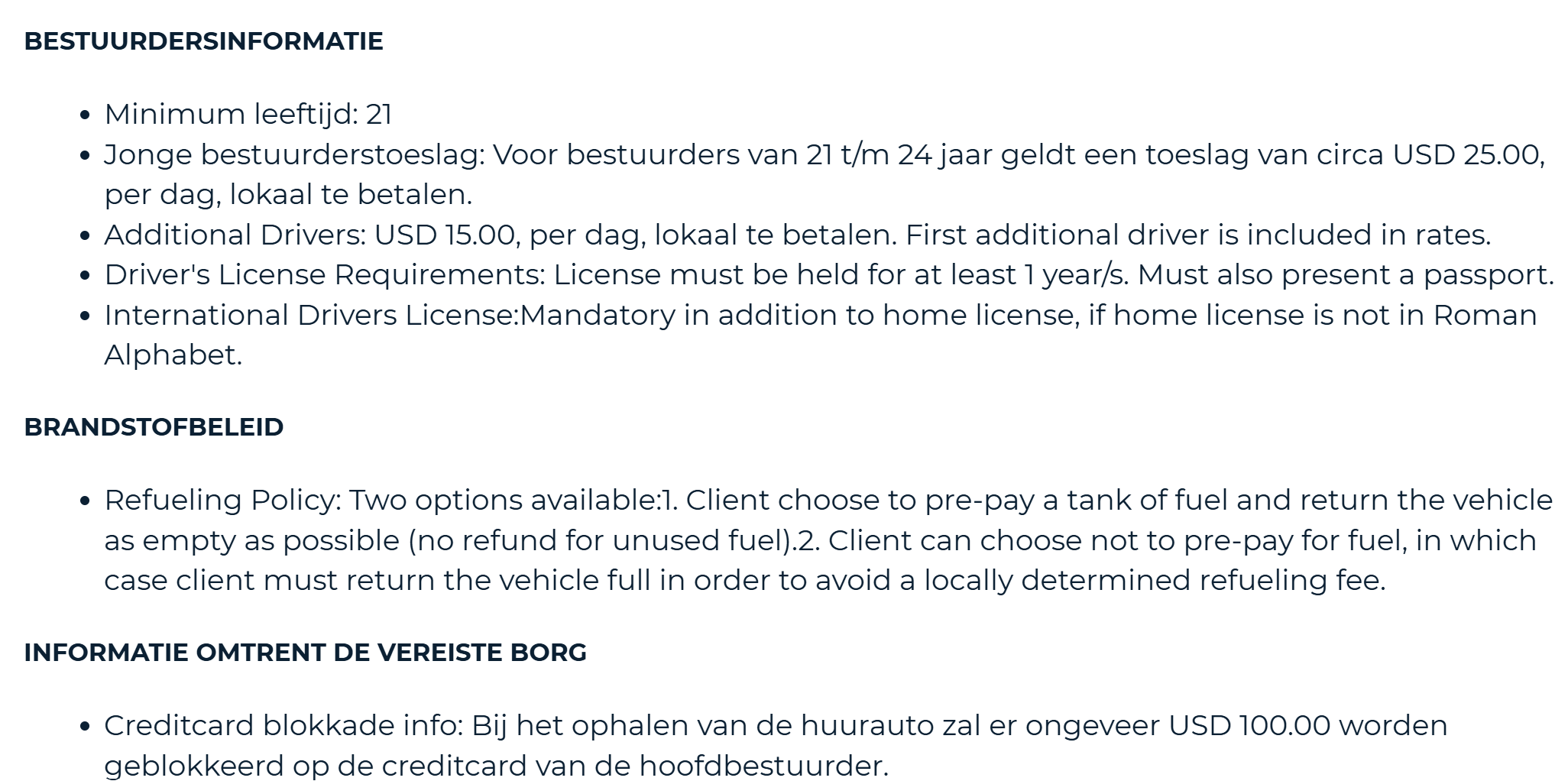 CDW = Collision Damage Waiver met of zonder eigen risico, afhankelijk van het autoverhuurbedrijf. De CDW dekt nooit schade aan banden, glas, buitenspiegels, onderzijde, interieur, dak, motor, schade aan sloten en verlies van de autosleutels.