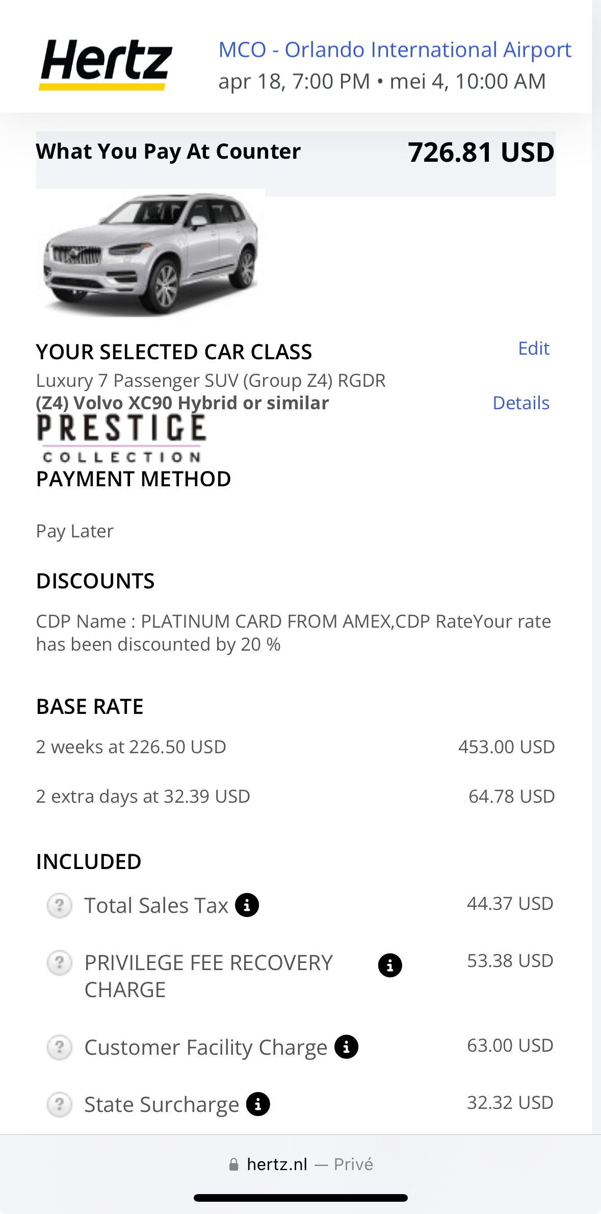 Dank! net een mooie Midsize SUV geboekt bij Hertz voor 2,5 week in de meivakantie. Was 740 dollar kwijt met cdp 427346 (ingelogd en Suriname als land gebruikt). Gold Canopy staat inderdaad op het laatste scherm dus hopelijk nog een mooie upgrade ter plaatse!