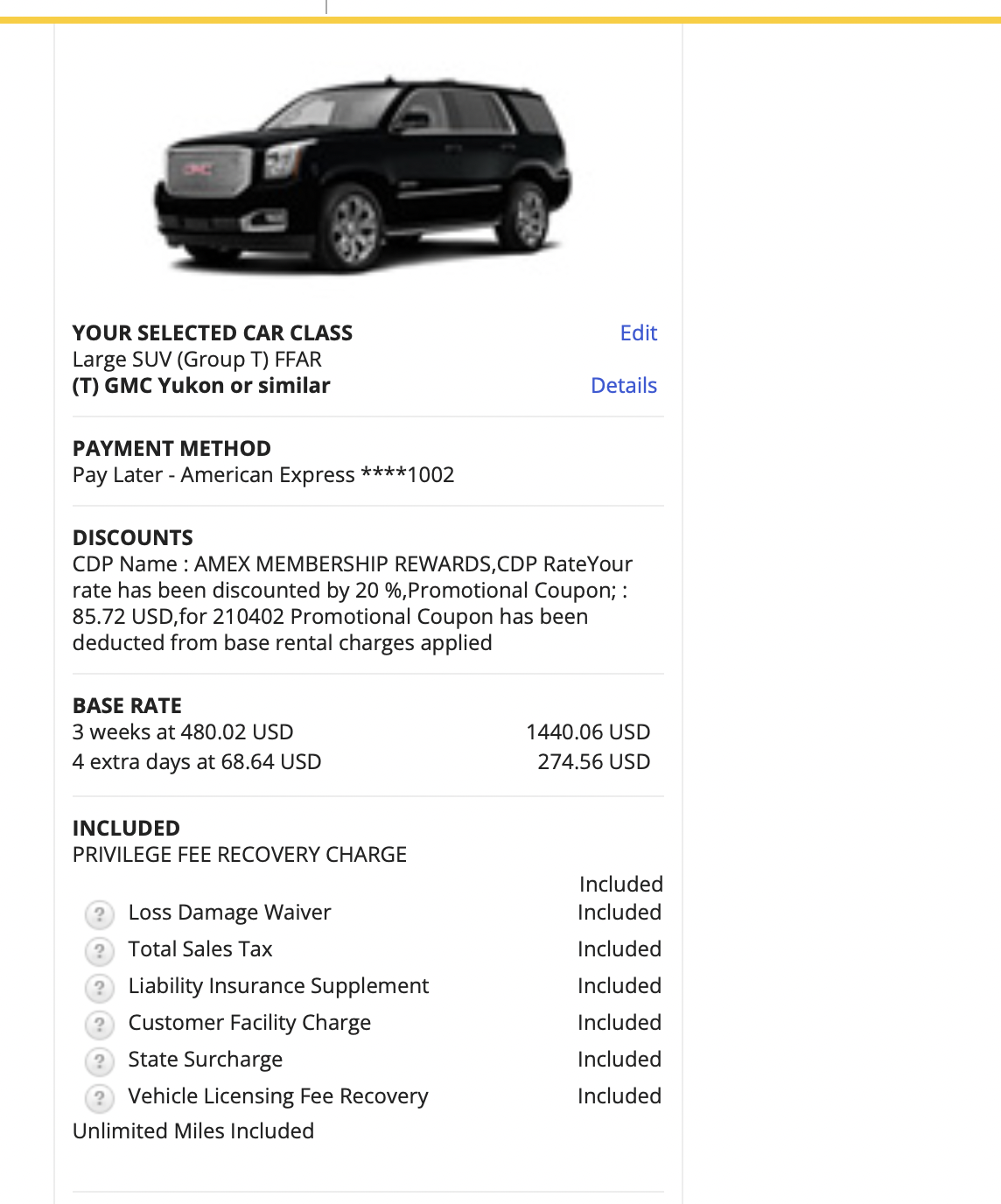 CDP Name : AF KLM NL AMEX SILVER CARD,CDP RateYour rate has been discounted by 15 %,Promotional Coupon; : 42.84 USD,for 210402 Promotional Coupon has been deducted from base rental charges applied,RQ: BEST