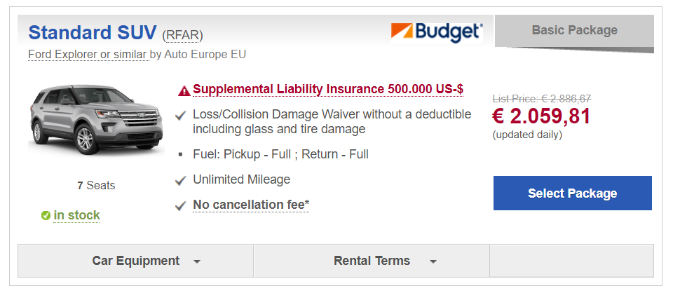 Ik heb helaas ook geen ervaring met Autoeurope, maar anderen op het forum wel. Ik zou even de zoekfunctie gebruiken. Het lijkt er inderdaad op dat je tot 48u gratis kunt annuleren en dat je de laatste 48u nog kunt bijverzekeren. Het enige wat je even bij AutoEurope zou kunnen navragen is de hoogte van de wettelijke aansprakelijkheid (sli). Daar was een paar pagina's terug wat onduidelijkheid over. Ik vermoed dat dit 500.000 betreft, net zoals bij 'moederbedrijf' van Budget, Avis. Dat is op de site van autoeurope niet te vinden. Drive-usa.de werkt tegenwoordig echter samen met auto europe en daar is de auto ook te boeken (zelfde vanafprijs, minder korting). Daar staat het wel bij, dus ik vermoed dat dit hetzelfde is, maar voor peace of mind kun je het even checken.dhelios schreef: ↑17 mar 2025, 23:21Trouwens @Belenos, ik zie de Ford Explorer staan nu voor de genoemde prijs. Nog nooit bij Autoeurope geboekt en er dient vooraf betaald te worden. En dan nog de tarieven met extra dekkingen, lariekoek denk ik, zou dan gewoon voor de standaard prijs gaan. Kom je idd uit op 1657 euro. Hebben jullie (en anderen hier) ervaringen met deze partij? Annuleren kan kosteloos tot 48u voor de huurtermijn begrijp ik? Hoe zit met 2e bestuurder, mijn vrouw namelijk. Meestal is spouse gratis elders, hier onduidelijk.