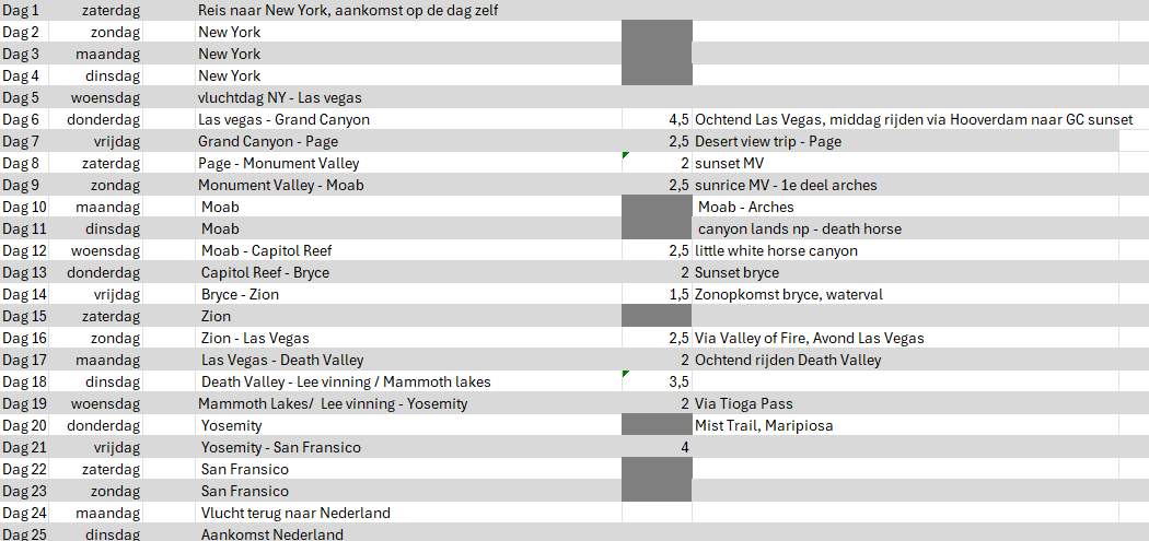 Jullie hebben een mooie route. Ik vind het zelf altijd wat jammer om NY er bij te doen, het gaat ten koste van de tijd die je voor het zuidwesten hebt, maar ik begrijp dat het een must is?