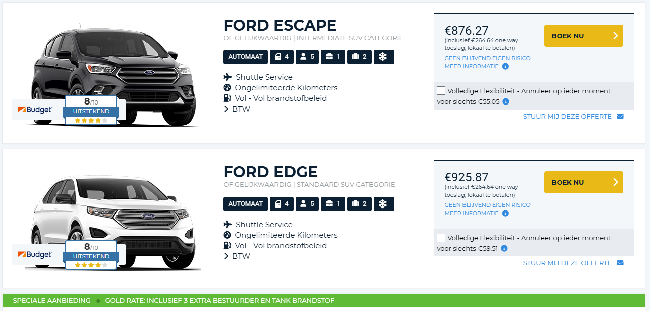 Ik heb de British Airways code N744100 gebruikt en kom uit op een Midsize SUV (Ford Edge of vergelijkbaar) voor een totaalprijs van $1.256,99 voor de periode van 1 augustus t/m 17 augustus.