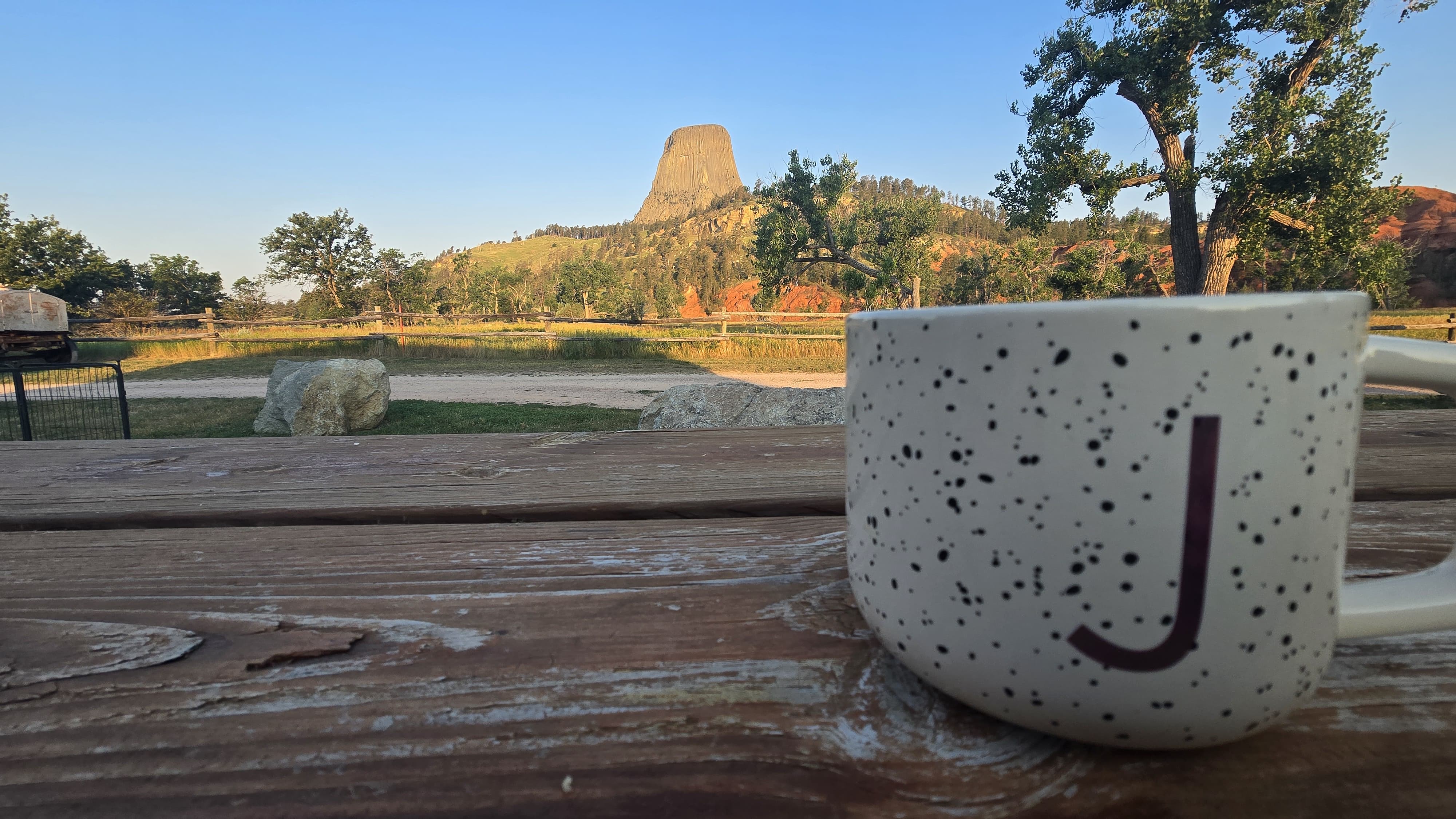 Zo... de zonnestralen hebben inmiddels Devils Tower bereikt. Prachtig om hier met een bakje koffie te zitten. Zo de kinderen maar eens wakker maken en dan via de Black Hills, Sturgis, Rapid City naar Wall/Badlands!