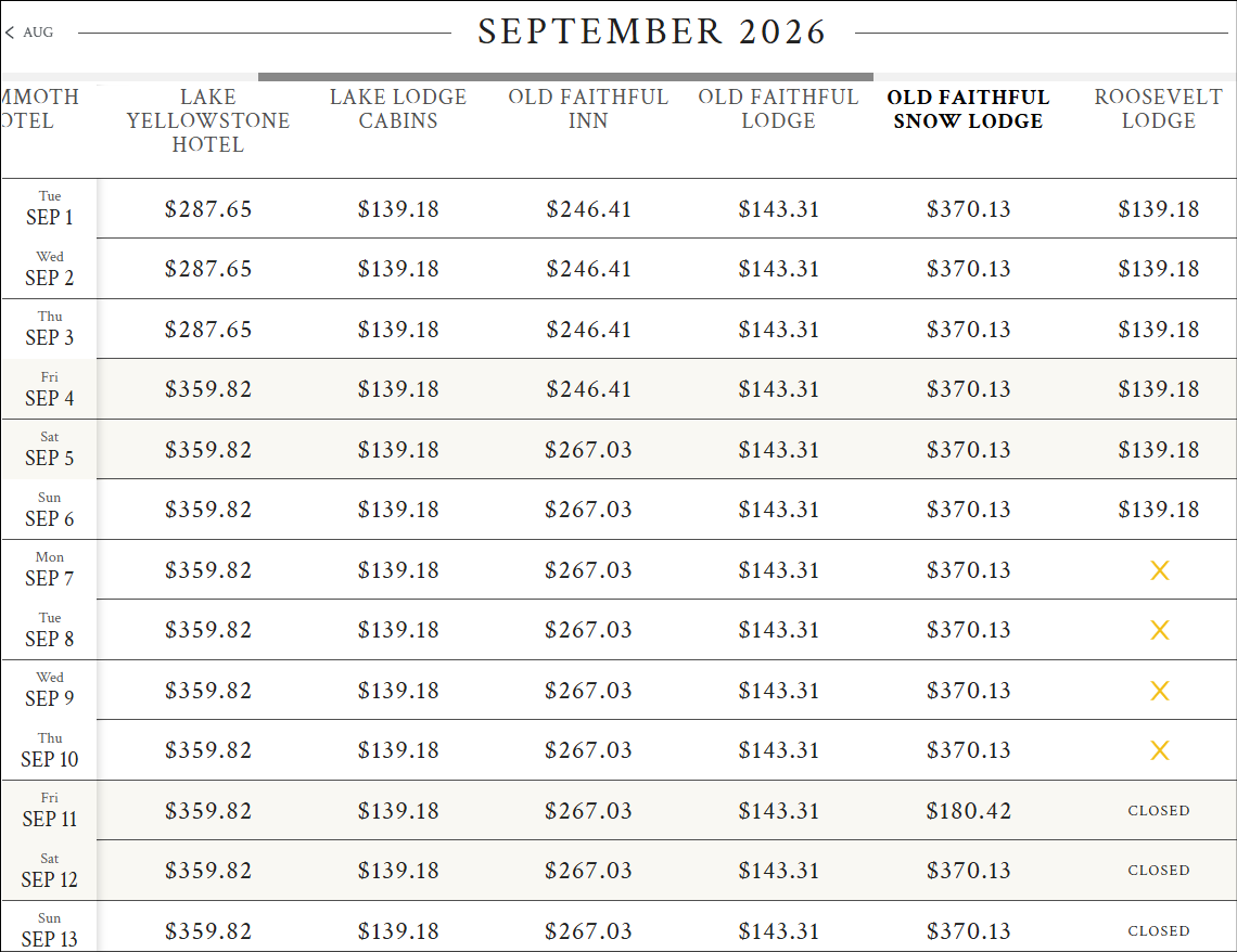 Je ziet bij de Snowlodge dure kamers maar ook een keer 180 dollar; dat is de frontier cabin. Die is nu maar op 1 datum beschikbaar, maar wellicht komt die op andere dagen ook nog vrij. De Lodge is sowieso beschikbaar in jullie periode.