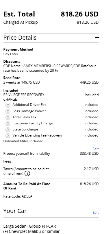 @Brownspider ook bij jou is het optelsommetje lager als je het zelf maakt nl. $ 784,90 ipv het bedrag dat Hertz rekent. Het lijkt wel of dat komt door de Liability die jij net als ik apart toevoegen. Toch apart waar dat verschil dan in zit.