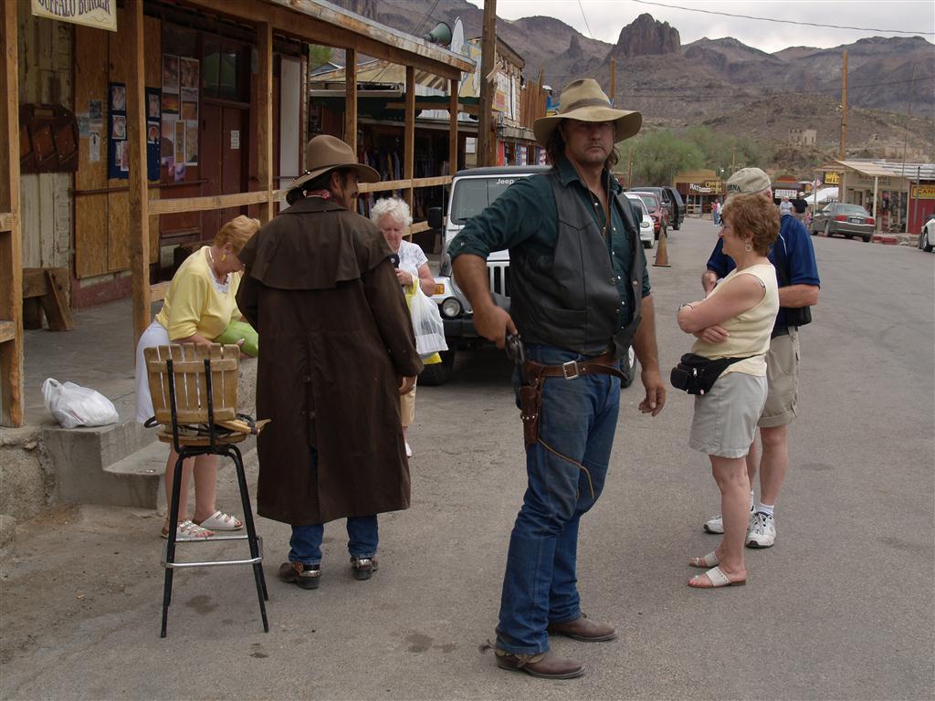 - in de loop der tijd hebben wij meerdere 'shootouts' gezien, waarbij zowel met geweren als met revolvers werd "geschoten". Maar dit zijn natuurlijk toneelstukjes, die voor de toeristen worden opgevoerd. Hierbij twee foto's uit Oatman, AZ na zo'n optreden.