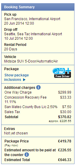 Vreemde is dat bij 20 dagen reservatie de prijs nog geen 1 £ scheelt en dan de Sales Tax, Concession recovery fee, Bus Lic als extra charge to be paid at the counter vermeld staan (zie screenshot). Nu staan duidelijk op mijn voucher van 21 dagen dat die inbegrepen zijn. Enkel dus de one-way-fee staat er niet op, maar als de manager van Alamo customer service het zegt dan vertrouw ik er maar op. Ik zal nog even mailen met de vraag voor bevestiging van mijn nieuw reservatie nummer.Rate Inclusions: £419.36