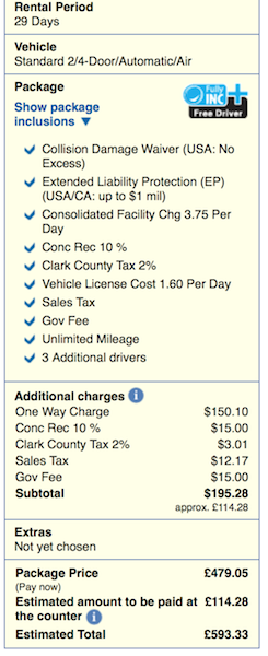 In het voorjaar had ik al eens gekeken naar de prijzen en de huurprijs is wel goedkoper geworden maar nu zie ik dat er bij het boeken bij deze prijs nog enkele extra's bijkomen die aan de counter betaald zullen moeten worden waaronder een one-way fee twv $150. We reizen van Las Vegas naar Los Angeles en ik dacht dat er dan geen one-way fee betaald moest worden? In het voorjaar zag ik deze extra's er niet bijstaan of heb ik er dan zo overgekeken? Of is er recent iets veranderd? Bovendien zie ik dat de overige extra's zoals die sales tax e.d. reeds in hun 'Package' inzitten, dus waarom reken ze dit dan toch nog extra aan?