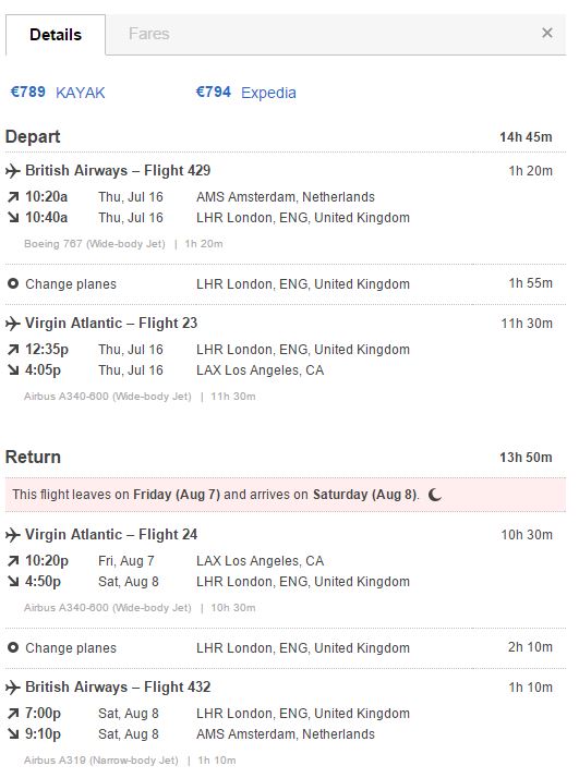 Mijn tip is en dat zullen zeker de andere forumleden hier ook zeggen "alle dagen vergelijken op de site, en verschillende site gebruiken en niet alleen connections raadplegen bv expedia,ebookers, orbitz, travelocity, momondo, kayak,ticketspy...)