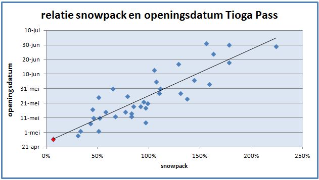 Ik heb de correlatie tussen snowpack en openingsdatum in een grafiek gezet. De afgelopen jaren was het mogelijk om met hulp van de grafiek en de snowpack van het betreffende jaar de openingsdatum van de Tioga Pass op een paar dagen nauwkeurig te voorspellen.
