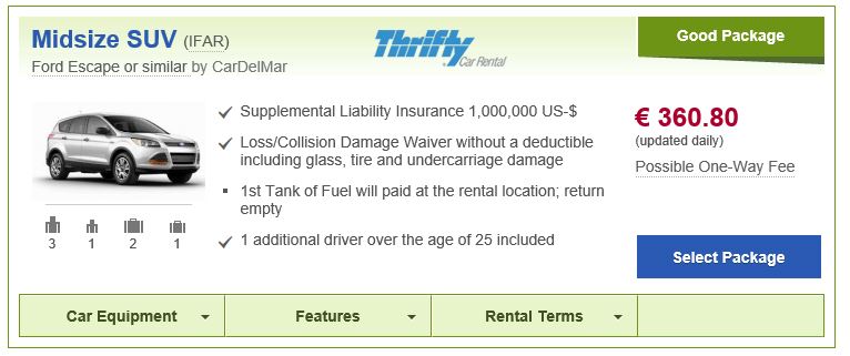 Oeps. Dat klopt. Alleen als je dan een midsize car ipv een midsize suv (wat ik overigens niet zou doen) bespaar je weer 100 euro waardoor het 850 wordt. Maar de bedoeling van dit antwoord was eigenlijk ook gewoon ervoor gaan zitten en het uitzoeken. Sommige reisbureaus hebben voor vlucht en auto en evt. 1e hotelnacht(en) best goede deals hoor. Maar deze moeten er altijd op verdienen, dus vaak zie je nog wel goedkopere aanbiedingen.
