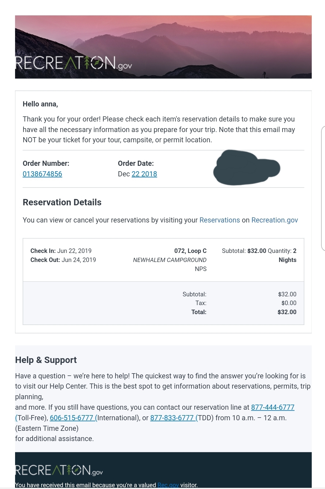 Via de https://www.recreation.gov website betaal je een reservation fee. Wanneer betaal je het resterende bedrag? Bij aankomtst of wordt het voor aankomst automatisch van je creditcard afgeschreven?