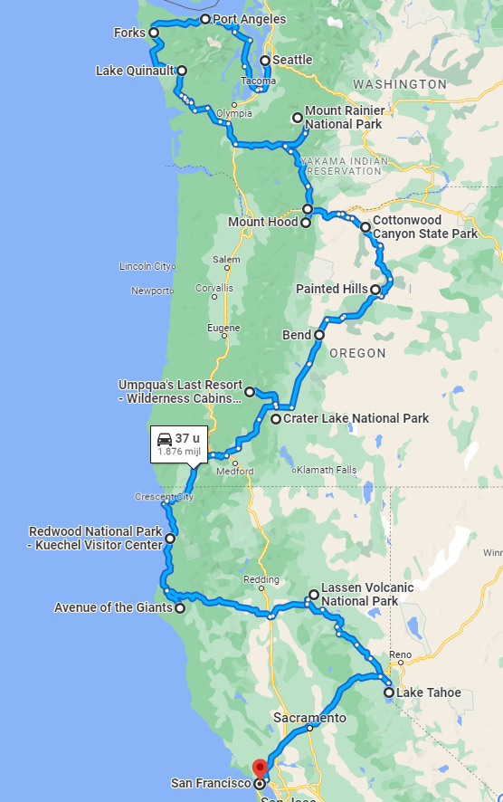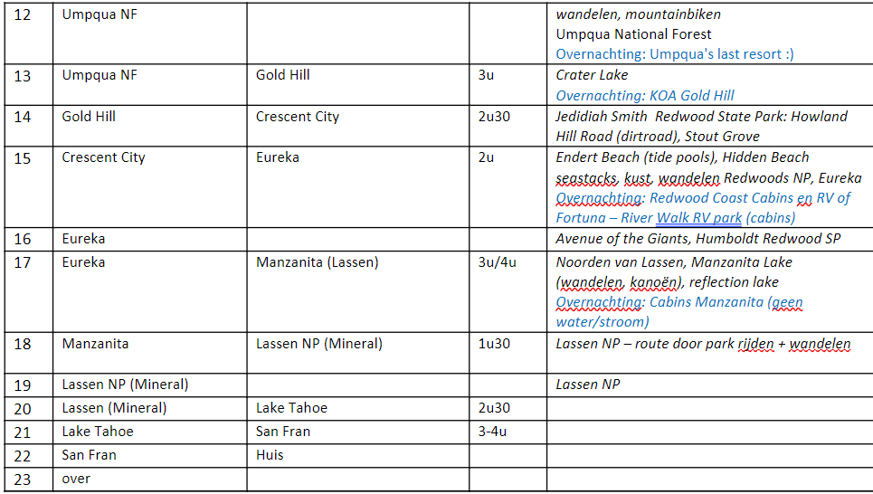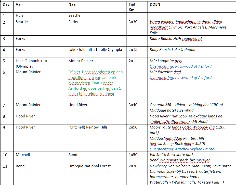 Highlights in reisvolgorde (uit mijn hoofd): Yosemite, Lake Tahoe, Lassen, Crater Lake, Bend/John Fossil Day beds, Portland/Columbia river gorge, Mount St Helens, Mt Rainer, Seattle, Norrth Cascades, Olympic. Verder langs de kust weer terug naar SF, met Redwoods NP en Point Reyes.