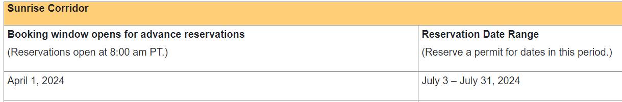 @Robbie&Irene : Sunrise Permits voor 3-31 juli dienen op 1 april geboekt te worden ! 8 am PT: dus volgens mij om 16.00 uur onze tijd (zomertijd dan weer)