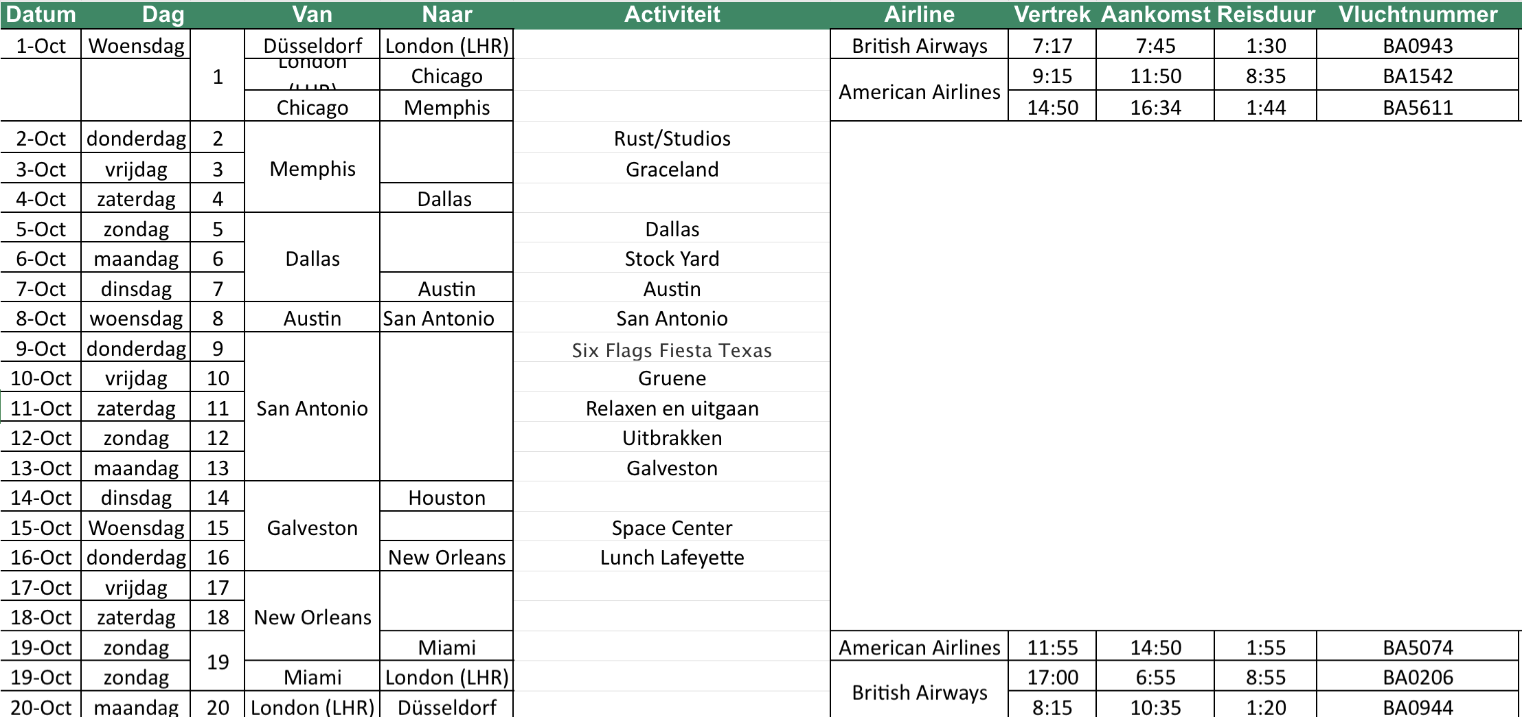 We zijn bezig met het plannen van een rondreis van Memphis naar Dallas, daarna Houston en uiteindelijk New Orleans. Vluchten zijn al geboekt, auto ook geregeld, maar de rest staat nog lekker open.
